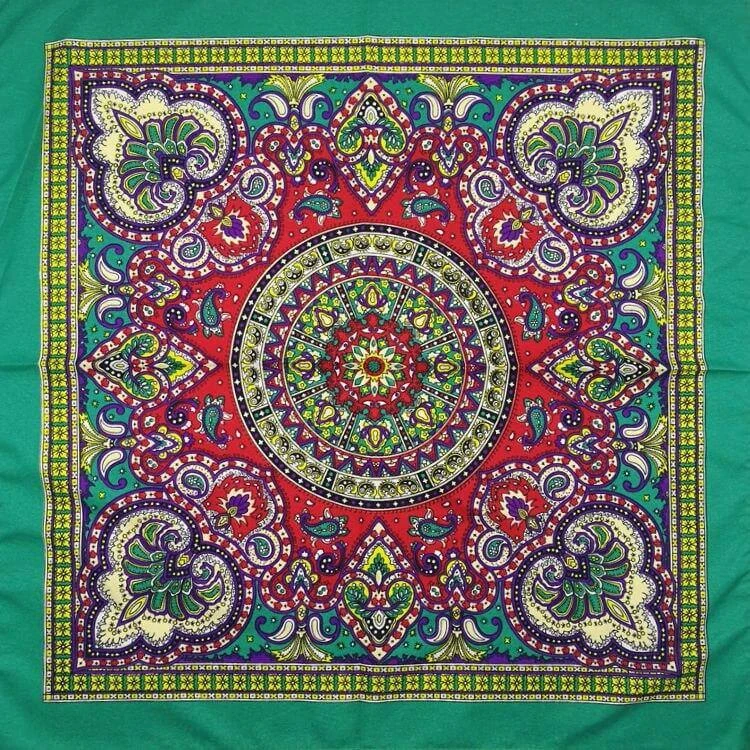 Notre Bandana Motif Indien Vert peut être porter à des fins seulement de styles, et aussi utilitaires, en aspirant entre autres, la sudation de votre visage.